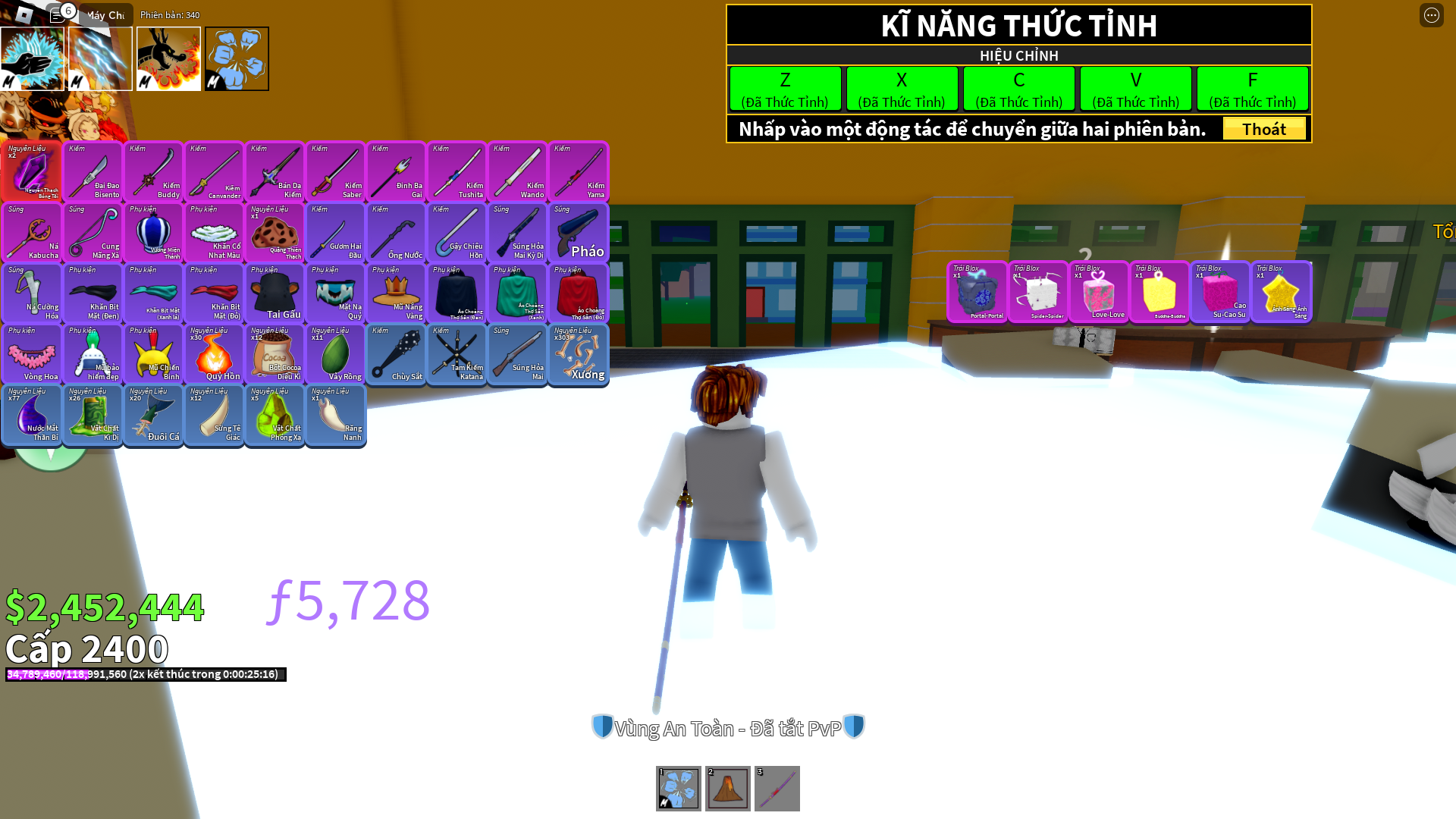 MaxLV(2400),Beli:8.133M [Fruit:Magma,Awake Full Skill] (Fragments:5.73K,World:Sea3,Human,Bounty:1.97M) (Fruit Inventory:Nhiều df) (Melee:SharkmanKarate,DragonTalon,ElectricClaw,Superhuman) (Weapon Inventory:Yama,Wando,Tushita,Spikey Trident,Nhiều vũ khí khác)